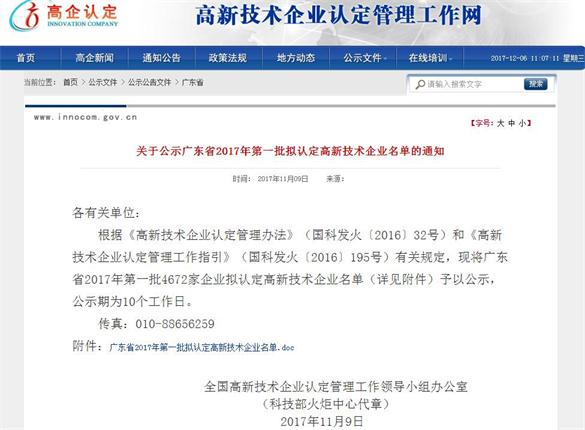 日前,科技部火炬中心公布了2017年廣東省第一批擬認(rèn)定國家高新技術(shù)企業(yè)名單,此次在高新技術(shù)企業(yè)認(rèn)定管理工作網(wǎng)上公示企業(yè)有4672家,公示期為10個(gè)工作日。
