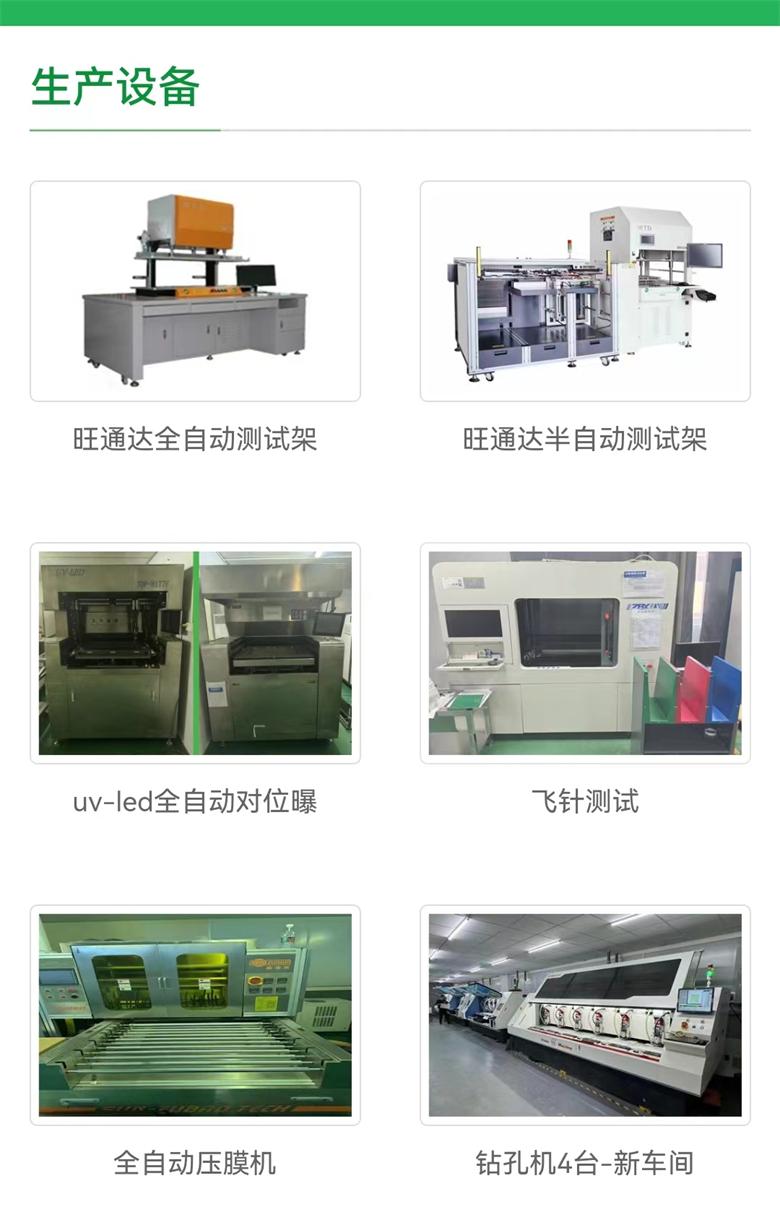 新增設備:鉆孔機4臺,旺通達半自動測試架和全自動測試架各兩臺,飛針測試機,uv-led全自動對位曝光機,全自動壓膜機等等,